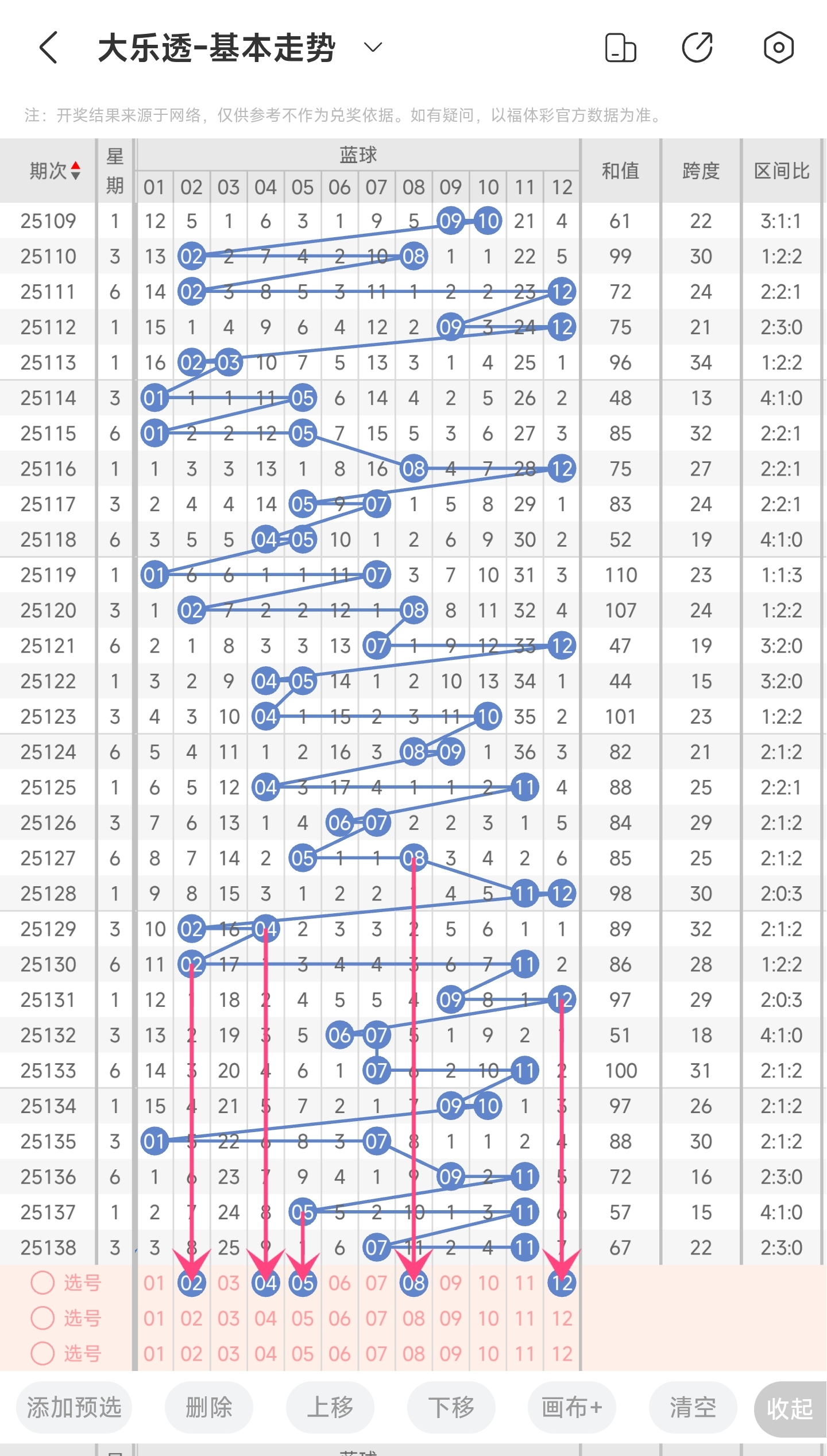 上期开出了7,11号球。往前一期开出了5,11号球。可以看到11号球开了连续开了3期,这是非常少见的,本期继续开11号球的概率已经大大降低了,本期可杀掉了。除此之外,通过分析蓝区走势图,我们可以看到蓝区开出的号码跨度整体大多数情况下基本遵循一大一小这样子开。上期开了跨度比较小的号码。推测本期跨度会变大,可以关注跨度比较大的号码。然后再结合冷热号情况以及遗漏期数,本期我们可以关注2,4,5,8,12等号。综上所述本期我们推测可能开出2,4,5,8,12等号码。