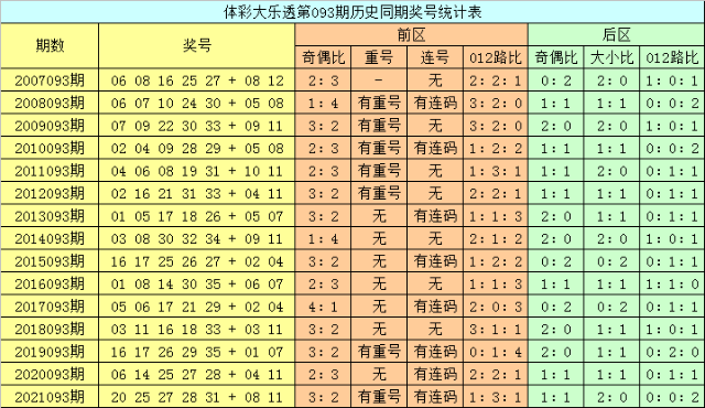 1。历史同期开奖中,前区奖号有7期包含了重复号码,重复号码开出期数比为50。0%,有8期包含了连码组合,连码开出期数比为53。3%,本期不看好去年同期(第2021093期)落号,排除这5个号码,排除连码出现的可能。