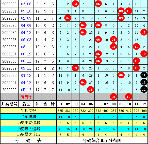 4。历史同期后区号码01、03、06、10、12出现次数最少,为1次,号码11开出次数最多,为7次;