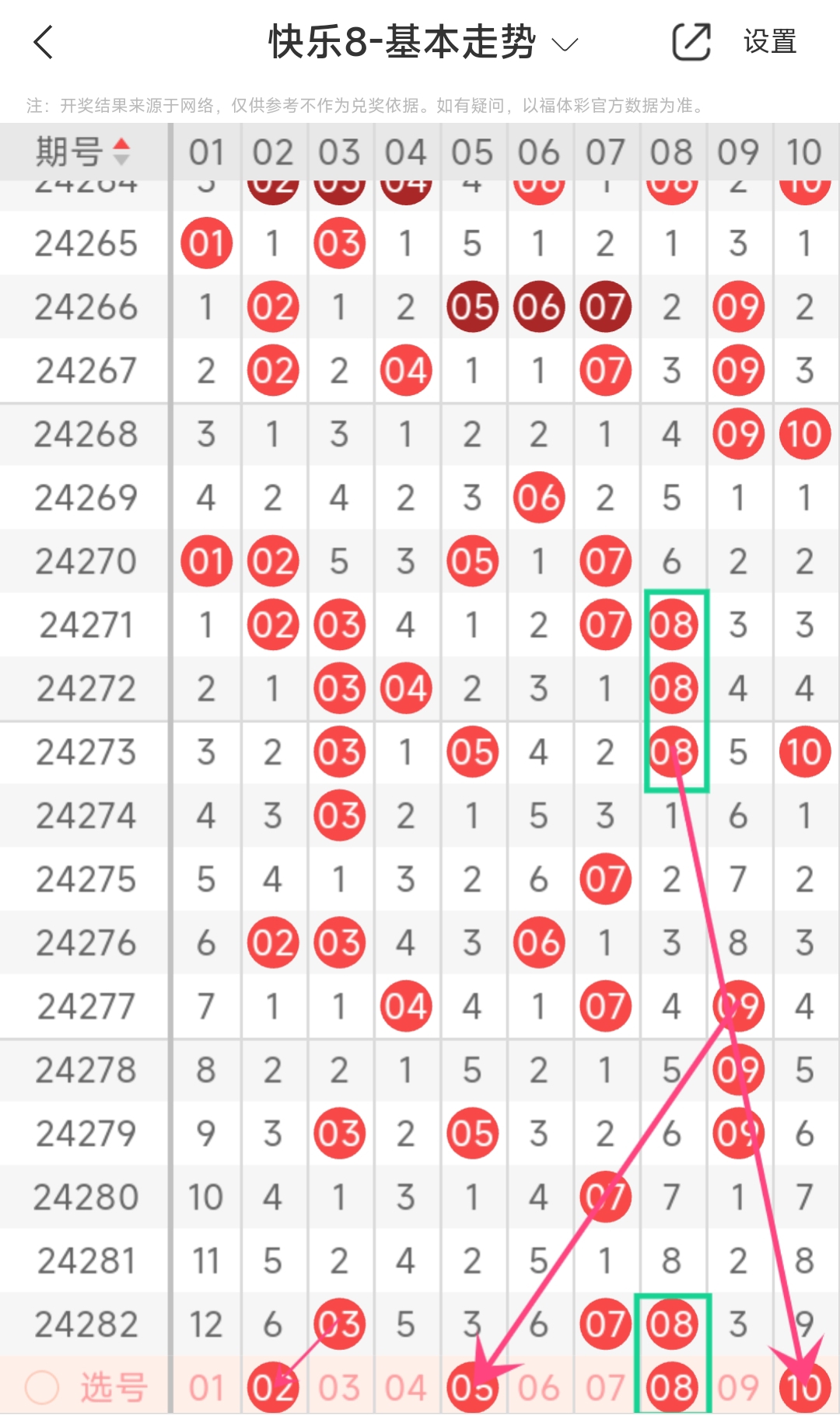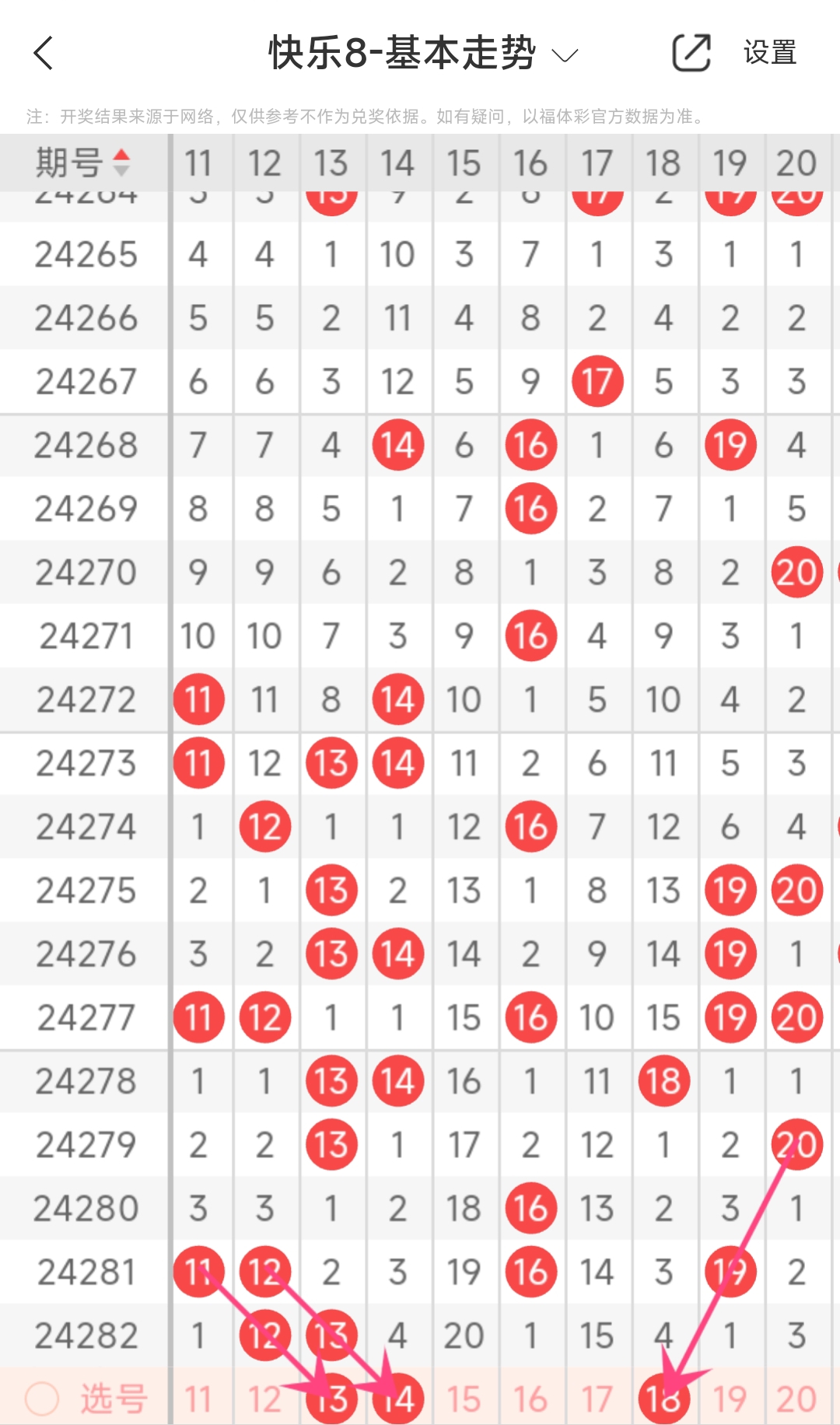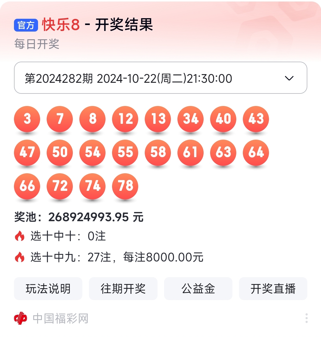 下面是我对2024283期福彩快乐8的分析和预判,希望通过我的分析能让大家今晚大红!福彩快乐8上期开奖号码如下图