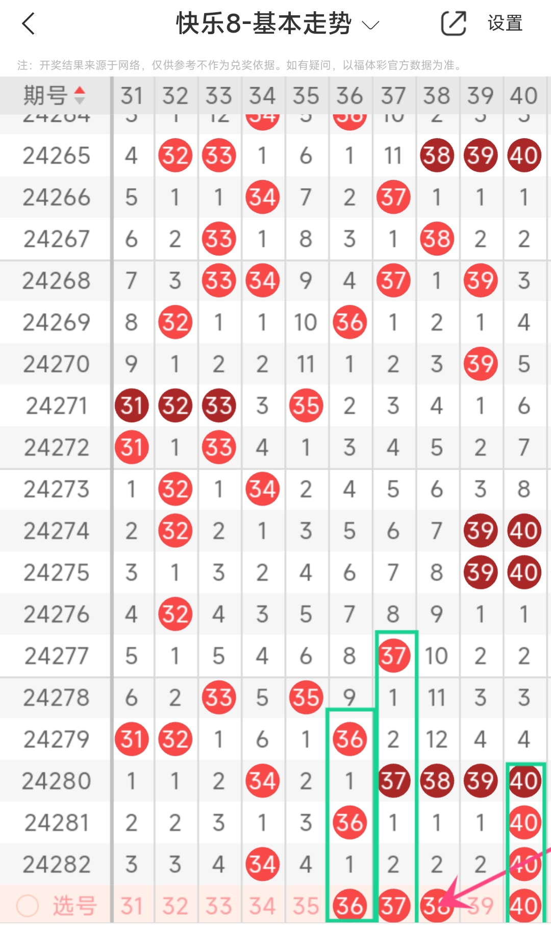 上期第四区间开出34 40,本期我们可以从上面走势图中看到选号的思路,本期推荐36 37 38 40