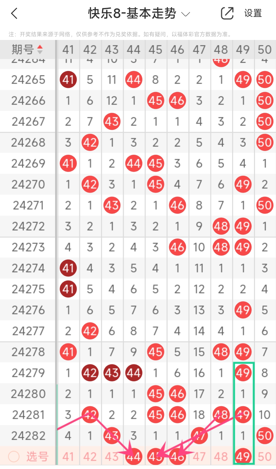上期第五区间开出43 47 50,本期我们可以从上面走势图中看到选号的思路,本期推荐44 45 46 49