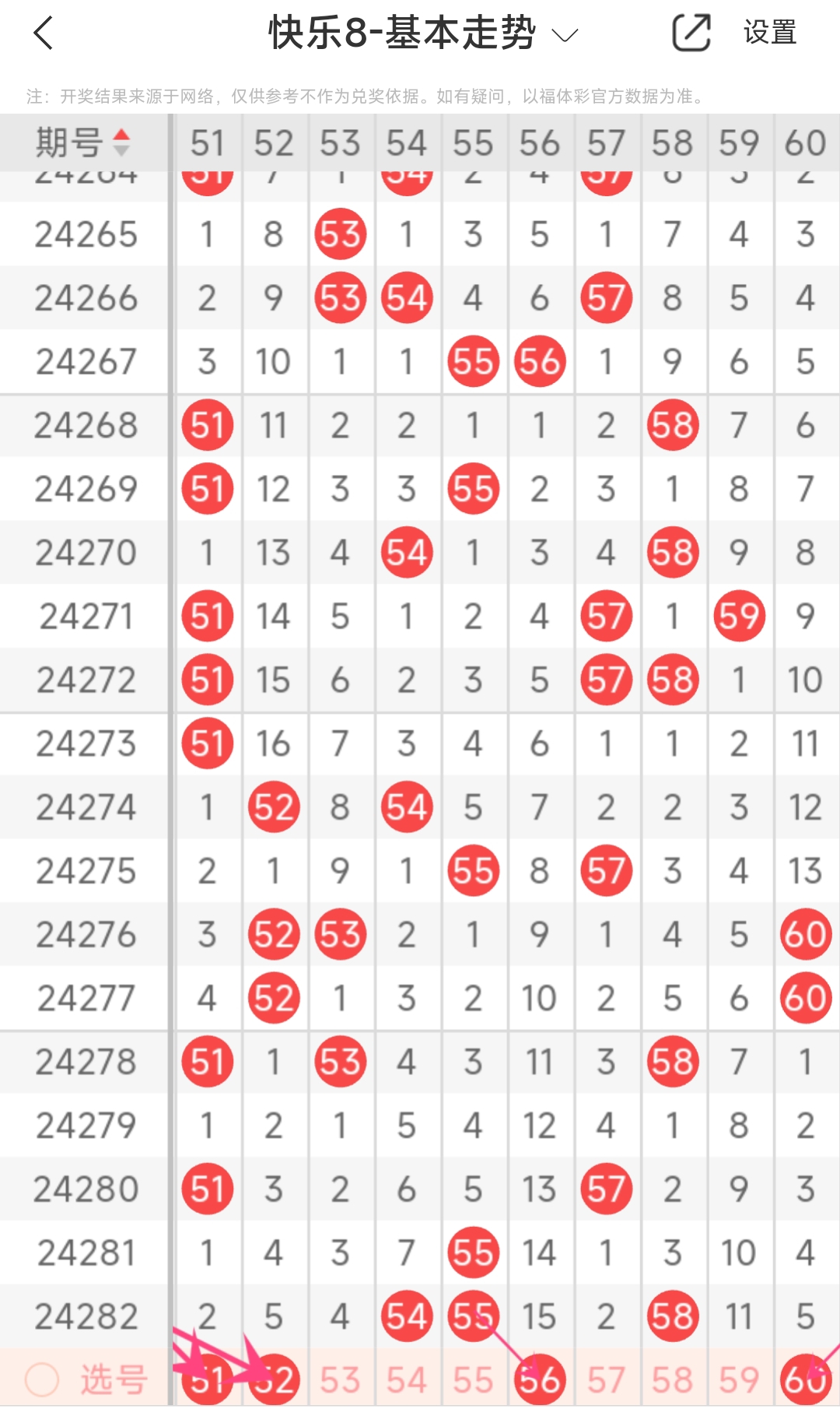 上期第六区间开出54 55 58,本期我们可以从上面走势图中看到选号的思路,本期推荐51 52 56 60