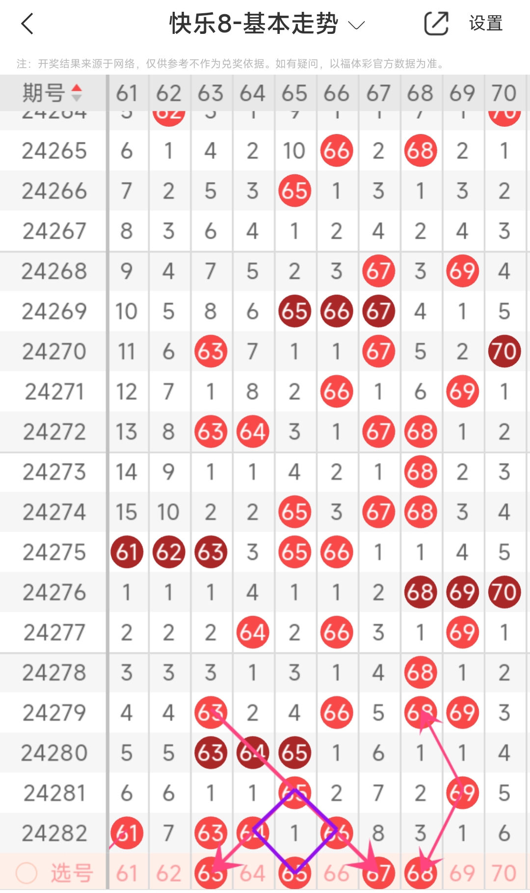 上期第七区间开出61 63 64 66,本期我们可以从上面走势图中看到选号的思路,本期推荐63 65 67 68