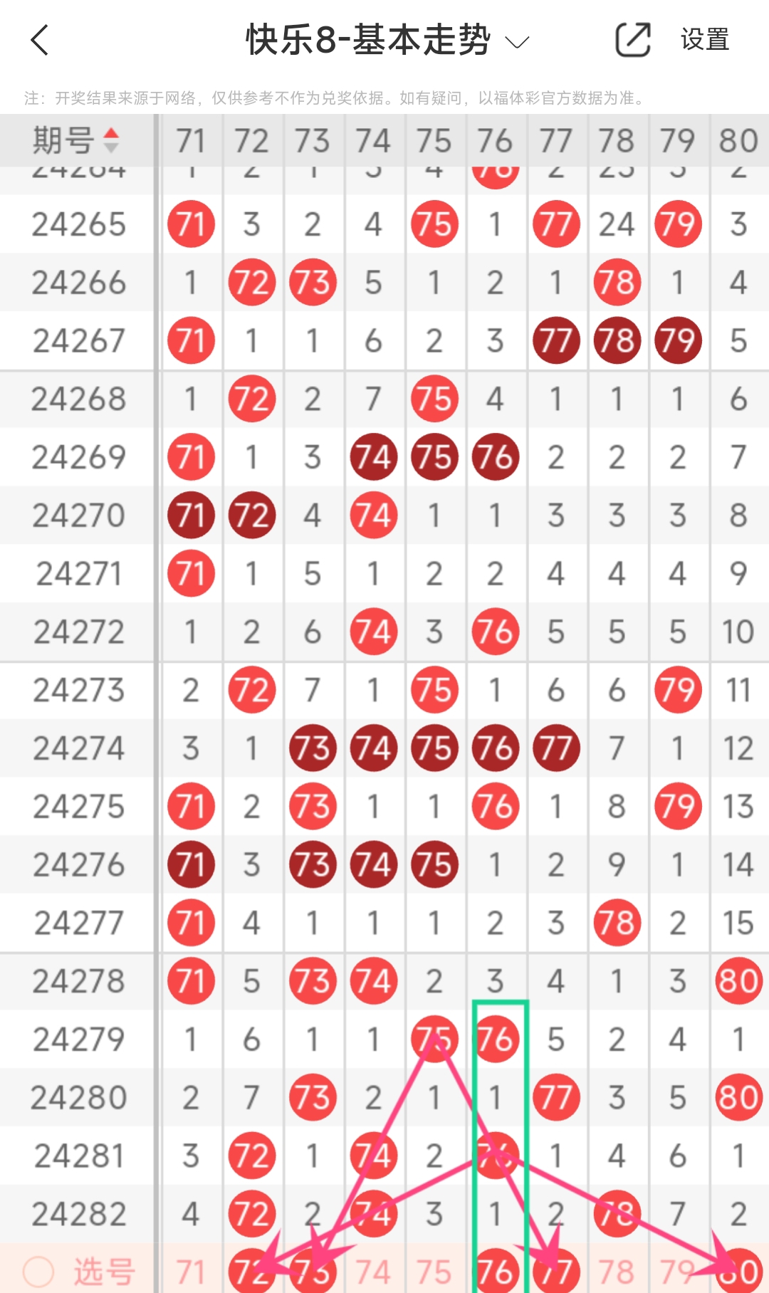 上期第八区间开出72 74 78,本期我们可以从上面走势图中看到选号的思路,本期推荐72 73 76 77 80
