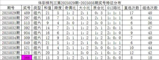 开奖公告:体彩排列三第2025038期开出奖号:366。组三,无重号,奇偶比1:2,大小比2:1,012比3:0:0,和值15,跨度3。
