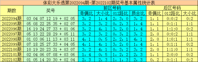 上期回顾:体彩大乐透第2022102期开奖号码为:01 05 14 20 30 + 02 04,其中前区号码奇偶比为2:3,大小比为2:3,012路比为1:1:3,质合比为2:3,后区号码奇偶比为0:2,012路比为0:1:1,大小比为0:2。