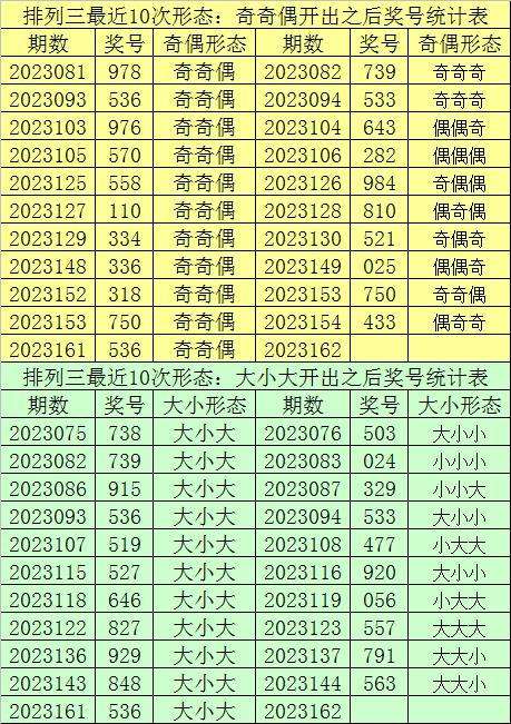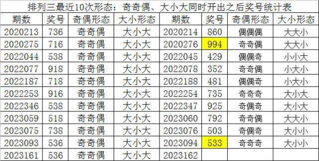 排列三最近10次同时开出奇偶形态:奇奇偶和大小形态:大小大时其奖号分别为:736-716-538-918-718-916-538-518-738-536-536,下期分别开出号码为:860-994-429-352-481-735-925-792-503-533,详细统计见下表: