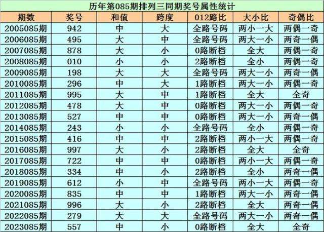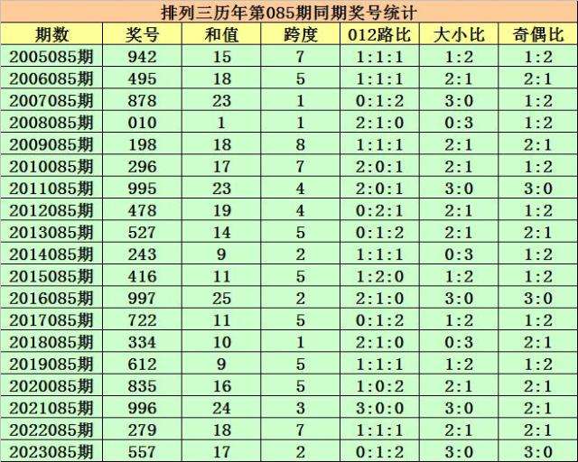 历史上第2024085期排列三已开出19期奖号了,历年同期奖号分别为:942、495、878、010、198、296、995、478、527、243、416、997、722、334、612、835、996、279、557,详细统计见下表: