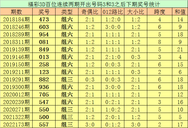 百位号码:连续两期百位出号分别为:3-3,历史上福彩3D连续两期前后分别出号3-3的奖号共出现69次。在百位3-3的奖号现象出现时,近15期下期分别出号:473-603-954-081-849-013-258-123-882-936-705-547-550-500-557;