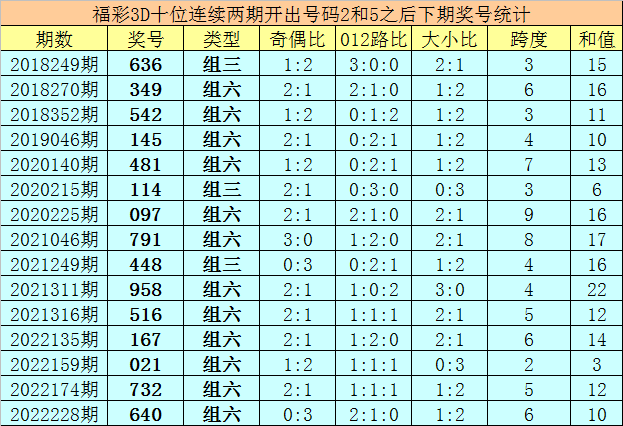 十位号码:前两期十位分别出现奖号2-5,历史上福彩3D连续前后分别开出号码2-5的现象共开出74次。在十位2-5的现象出现时,最近15期其下期分别开出号码:636-349-542-145-481-114-097-791-448-958-516-167-021-732-640;