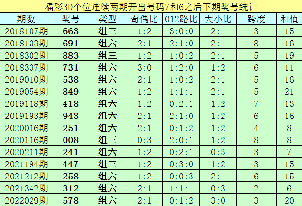 个位号码:最近两期个位开出号码为7-6,在福彩3D历史开奖中,前后两期个位分别开出号码7-6的奖号出现了69次。最近15期个位7-6组合出现之后,其下期奖号分别为:663-691-883-731-538-849-418-943-251-008-241-447-258-312-578;