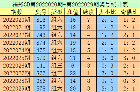 上期回顾:福利彩票3D第2022029期开出奖号578。奖号类型:组六,大小形态:大大大,奇偶形态:奇奇偶。