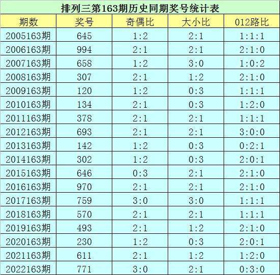 排列三第2023163期开奖日期:2023年6月22日,历史上第163期已开出了18次奖号,历年同期号码分别为:645、994、658、307、120、134、378、693、142、302、646、970、759、570、493、230、611、771。