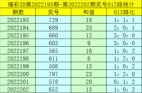 福彩3D第2022203期012路分析