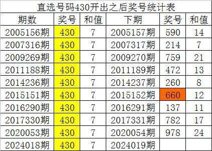 福彩3D第2024018期开出直选号码为:430,该直选号码历史上出现了10次,其下期分别开出了号码:590、214、759、472、260、660、137、782、978,如图: