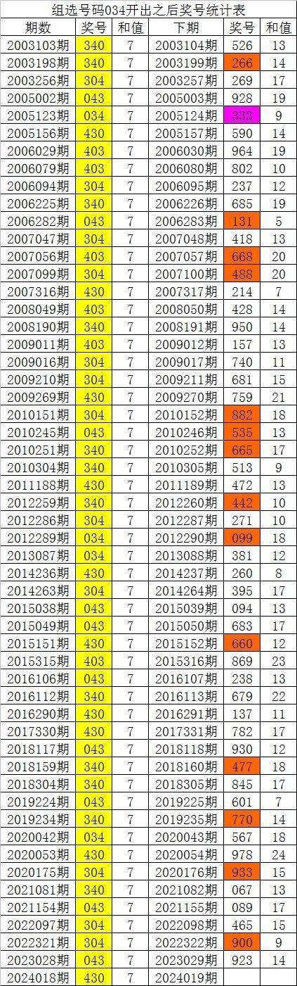 福彩3D第2024018期开出组选号码:034,该号码历史上组选出现了54次,其下期分别开出了号码:526、266、269、928、333、590、964、802、237、685、131、418、668、488、214、428、950、157、740、681、759、882、535、665、513、472、442、271、099、381、260、395、094、683、660、869、238、679、137、782、930、477、845、601、770、567、978、933、067、089、465、900、923,如图:
