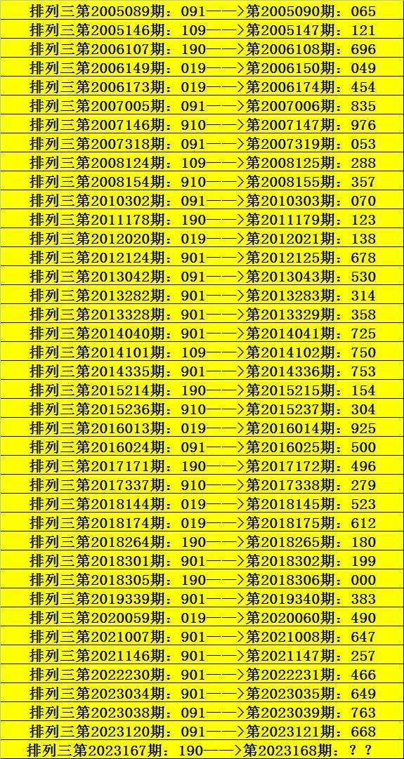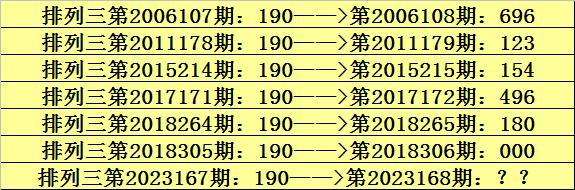 第2023167期排列三奖号为190,历史上该号码直选出现7次,下期奖号分别为:696、123、154、496、180、000。