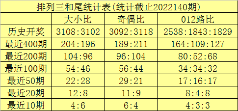 和尾大小推荐:分析前50期开奖,和尾大小比开出22:28,小和尾相对较少;分析前20期开奖,和尾大小比出现12:8,大和尾相对较热,本期看好和尾走大。