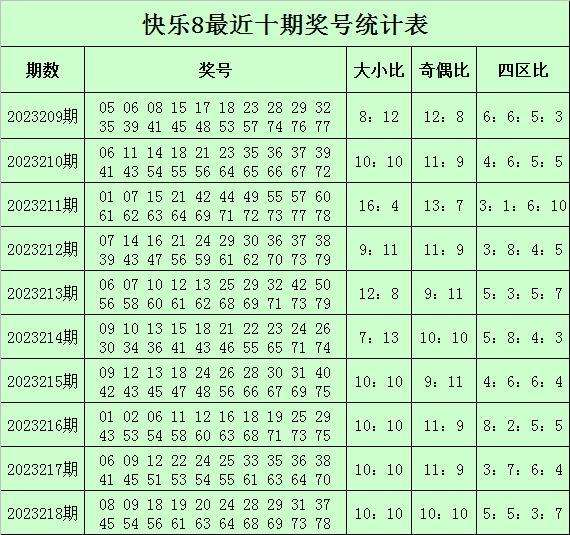 福彩快乐8第2023218期开奖回顾:08 09 18 19 20 24 28 29 31 37 45 54 56 61 63 64 68 69 73 78,其中奖号四区比为5:5:3:7,奇偶比为10:10,大小比为10:10。