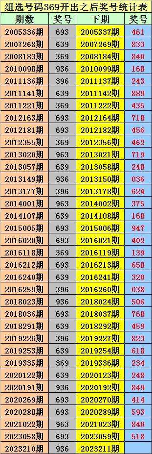 排列三组选369出现之后下期分别开出:461、833、840、168、243、889、435、718、456、462、719、248、036、624、375、168、947、402、139、658、320、038、506、768、459、823、618、234、248、849、414、593、840、518。