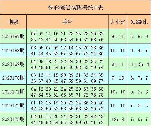 快乐8第2023173期奖号为:02 10 15 20 24 28 31 32 42 43 44 45 52 54 56 68 69 70 71 72,其中奖号012路比为7:6:7,大小比为12:8。