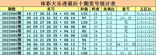 上期开奖:大乐透第2022089期奖号为:01 20 21 31 33 + 03 11,前区号码和值为106,跨度为32,奇偶比为4:1,重号:01、20,五区比为1:0:2:0:2。