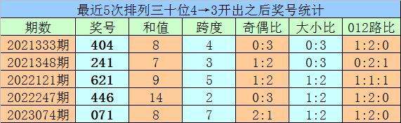 1、最近两期排列三十位号码开出号码分别为4和3,历史上十位号码连续两期同时出现号码4和3的奖号共开出77期。最近五次下期开出号码为:404、241、621、446、071;