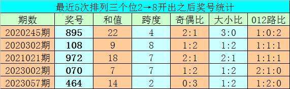 1、排列三前两期个位分别开出号码2和8,历史上个位号码连续两期分别出现2和8时,共有72次。在最近5次出现时,其下期分别出现号码:895、108、972、070、464;