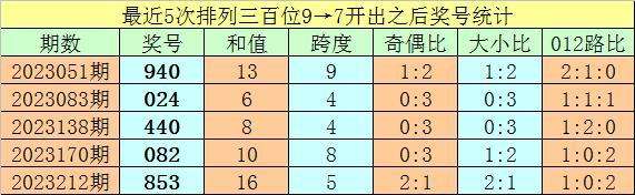 1、排列三最近两期百位号码分别开出9和7,历史上百位号码连续两期分别开出9和7的奖号出现了64期。前五期开出之后其下期奖号分别为:940、024、440、082、853;