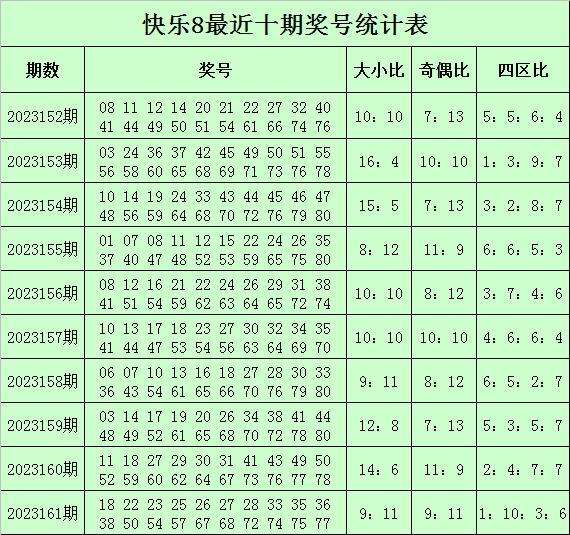 福彩快乐8第2023161期开奖回顾:18 22 23 25 26 27 28 33 35 36 38 50 54 57 67 68 72 74 75 77,其中奖号四区比为1:10:3:6,奇偶比为9:11,大小比为9:11。