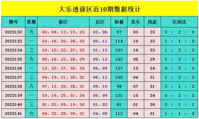 上期回顾:大乐透第2023141期:前区04、22、25、30、31,后区04、05,前区奖号和值为112,三区比为1:1:3,后区开出冷热组合04、05