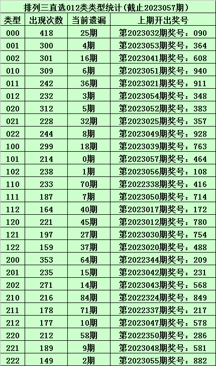 上期回顾:体彩排列三第2023057期开出奖号:464,其012路比为1:2:0,奖号012路类型为:101。