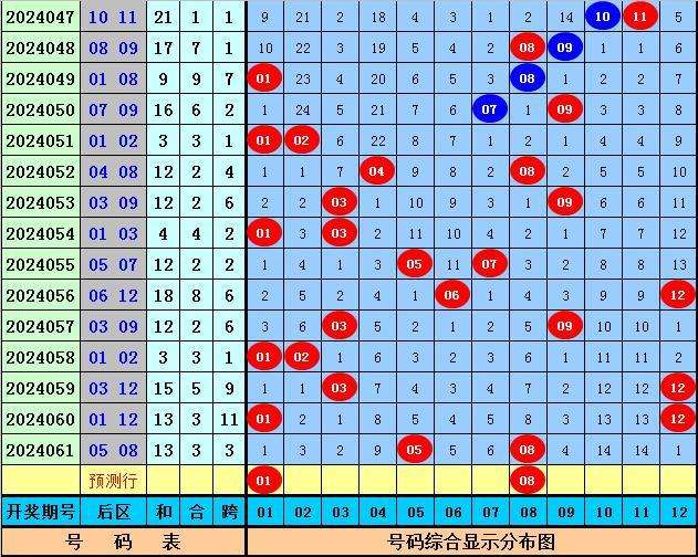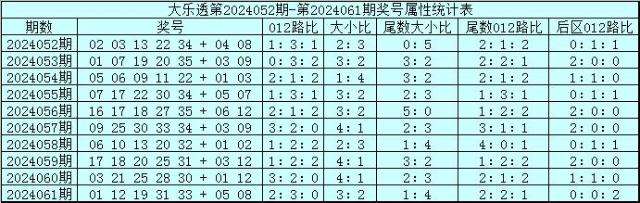 体彩大乐透第24061期奖号为:01 12 19 31 33+05 08,其中前区奖号012路比为2:3:0,大小比为3:2,奇偶比为4:1,包含同尾奖号:01 31。
