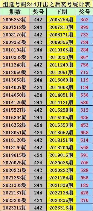排列三组选244出现之后下期分别开出:302、899、732、784、284、867、756、713、119、134、536、580、312、435、453、958、514、598、591、705、528、956、189、426、270。