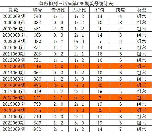 体彩排列三历年第069期开出奖号分别为:743、082、531、608、320、851、285、721、119、064、986、995、946、141、793、788、719、586、932。统计详见下表: