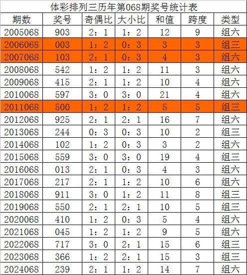在历年排列三第069期开奖中:号码大小比为31:26,大号表现较热,本期看好大号再次热出,大小比关注3:0。