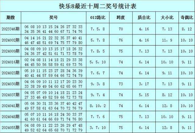 福彩快乐8第2024061期开奖回顾:08 10 18 33 34 36 41 42 44 46 47 51 53 54 61 62 64 65 69 72,其中奖号012路比为8:5:7,跨度为64,质合比为4:16,大小比为14:6,奇偶比为8:12。