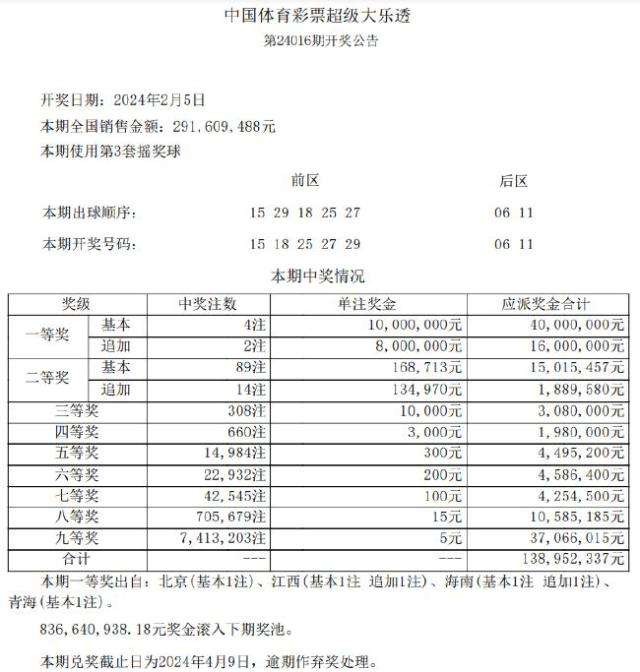 北京时间2月5日晚,体彩大乐透第24016期开奖,当期开奖号码为:前区15 18 25 27 29,后区06 11;本期全国销量为2。91亿元,计奖结束后奖池余额8。36亿元。