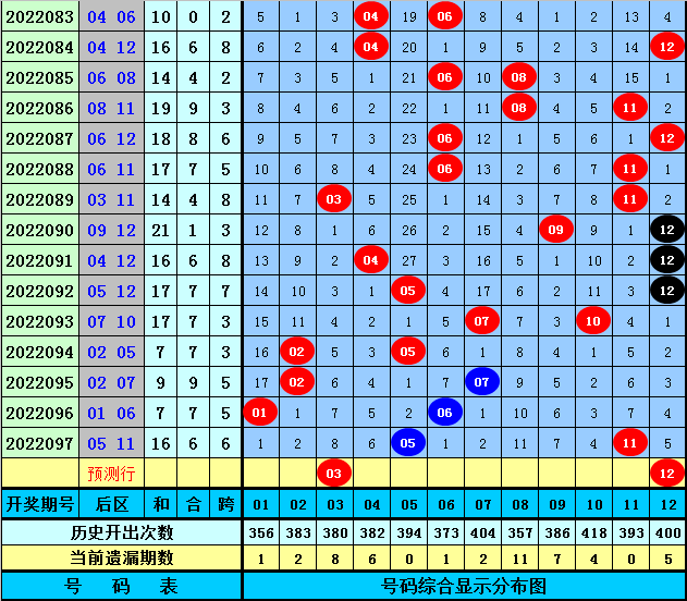 后区分析:上期后区开出一奇一偶、一大一小奖号05、11,近10期后区奖号奇偶比为11:9,奇偶号码开出个数基本相等,后区奖号大小比为10:10,大小号码开出个数基本相等,本期预计后区奖号出现在03、04、09、11、12中,参考号码03、12。