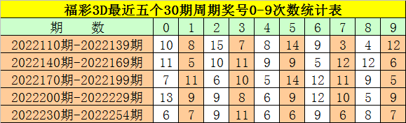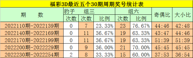 在最近一个30期周期内(第2022230期-第2022259期),组三(含豹子)号码共出现10期,占开奖总数的40%,组六奖号共出现15期,开出比例为60%,组六号码连续出现3期,表现非常活跃,本期预计奖号为组六号码。