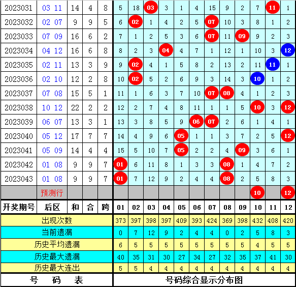 后区奖号分析:后区上期开出奖号01和08,0路号码断档,最近10期后区号码012路比为5:7:8,其中012路号码断档次数分别为:5次,3次,3次,本期防2路号码断档,参考四码奖号04、09、10、12。