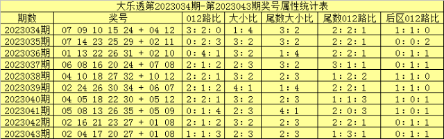奖号大小比分析:前区上期奖号大小比为2:3,小号表现活跃;最近10期奖号大小比为26:24,大小号码出号个数基本相当,本期适当关注小号热出,关注大小比1:4。