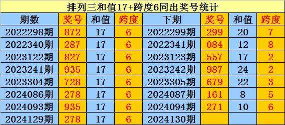 排列三近8次和值17+跨度6同出时奖号为:872、287、827、935、728、278、935、278,下期分别出现:299、084、557、987、679、161、271。