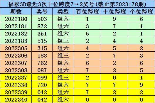 首位跨度分析:首位号码最近3期奖号为8-1-0,连续两期跨度为7、1,历史上首位号码连续两期分别开出跨度7、1的现象共出现90次,其前两次开出奖号分别为: