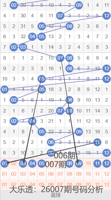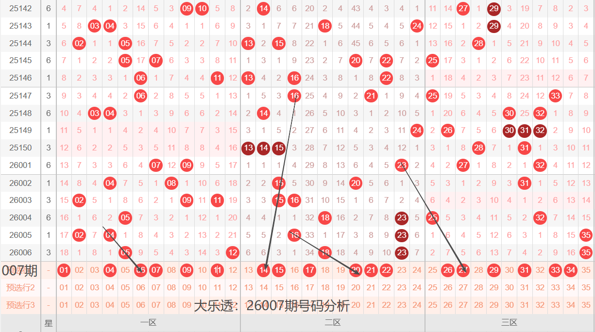 通过上期号码的简单分析,我们看下26007期红色号码球的总体走势,如下图: