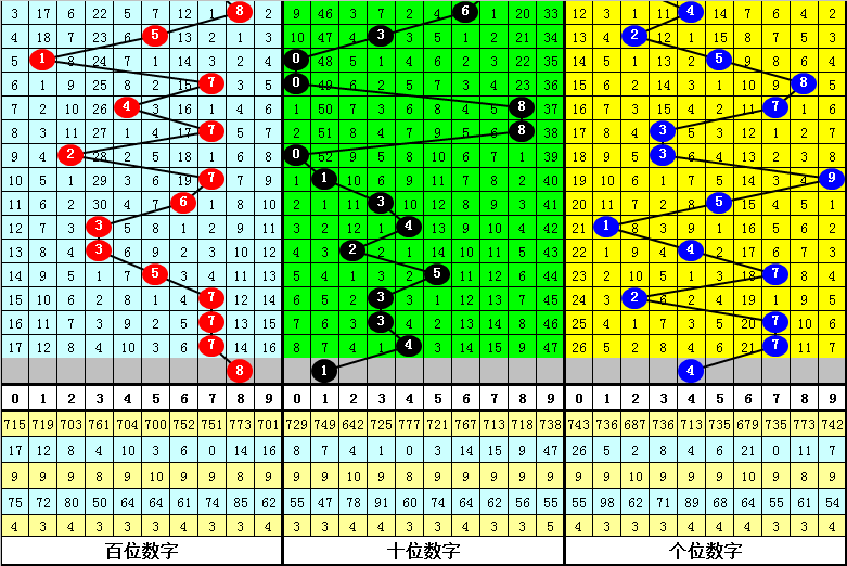 百位上期开出号码7为重号,本期关注该位上升,参考号码8。