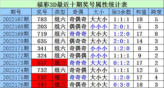上期回顾:上期开奖奖号为747,类型:组三,奇偶奇,大小大,0:3:0,和值18,跨度3。