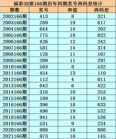 福彩3D第166期,历史上期开出20次奖号,其奖号分别为:413、289、644、775、426、581、128、209、503、454、112、042、316、189、396、496、941、531、808、873,奖号两码合差分别开出: