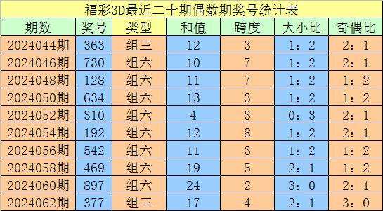 上期回顾:福利彩票3D第2024063期开出奖号349。奖号类型:组六,大小形态:小小大,奇偶形态:奇偶奇。